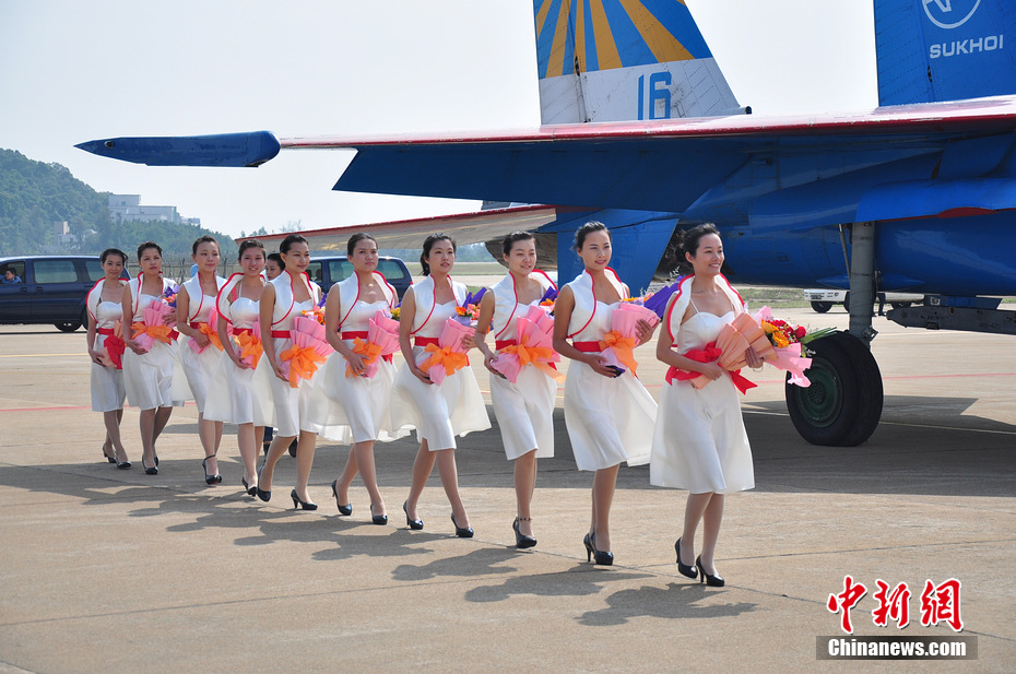 礼仪小姐准备给俄罗斯的飞行员献花。陈海峰 摄