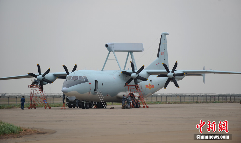 空警-200机载雷达天线类似体操用的平衡木,是中国自行研制的一种轻型、全天候空中型预警飞机,在运8C型机基础上进行了80%以上改动而成。曾在2009年国庆阅兵中现身。陈海峰 摄