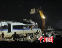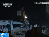 从25日晚上10点开始,挖掘机、起吊机开始对温州动车事故现场的车体进行破拆转运作业。到26日下午4点左右,事故现场车体的清理转运工作已经基本结束。
