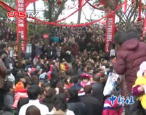 【解说】每当茶花盛开的时候,彝族人民就会聚集在一起,由彝族的毕摩为茶花祈福、招魂,浇上圣水,祈祷枝繁叶茂。2月8日,2012中国•楚雄国际茶花大会祭花仪式在云南省楚雄市紫溪山红墙土主庙举行。各国友人汇聚在一起,观看了彝族特有的祭茶花仪式,祈求风调雨顺,五谷丰登。年轻的毕摩身穿黑色的法衣,头戴法笠,显得高大威武。祭祀开始,他左手拿法杖,右手拿铜铃,一边摇晃铜铃,口里一边念念有词,声音高亢,让人听着觉得非常的神秘。