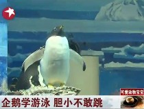 可爱小企鹅学游泳 胆小不敢跳下水