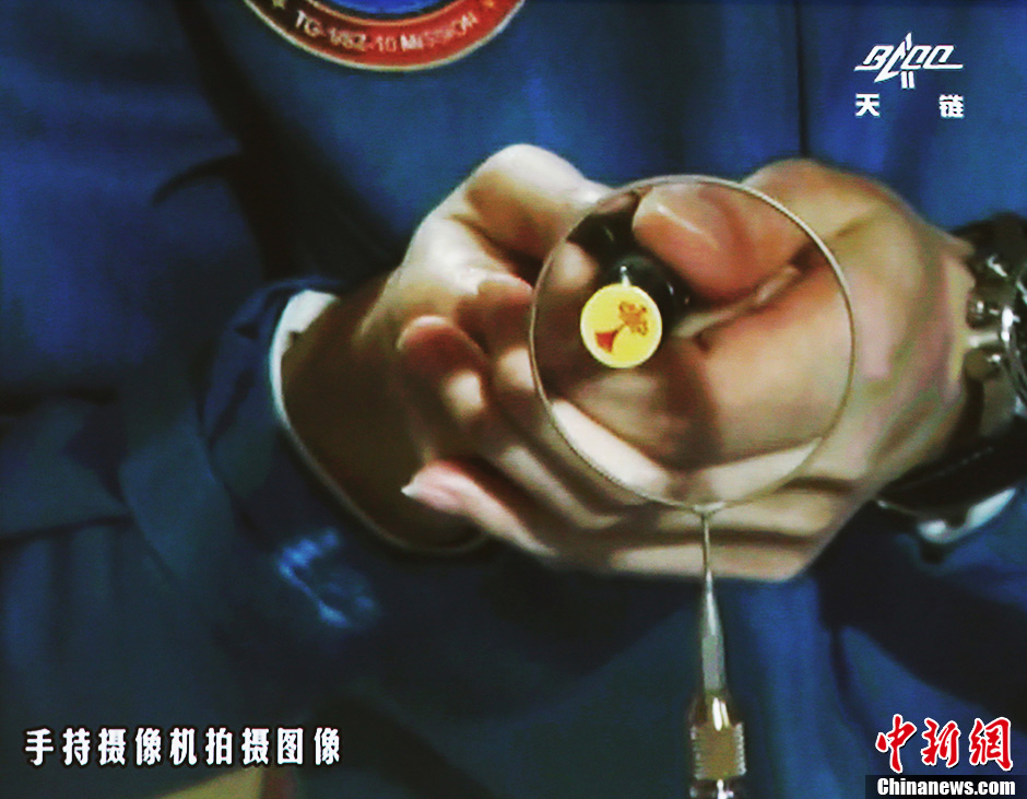 6月20日10时许,神舟十号航天员在天宫一号开展基础物理实验,为青少年进行中国首次太空授课。图为王亚平讲授太空失重提供条件下,在水膜上粘贴中国结演示。中新社发 秦宪安 摄